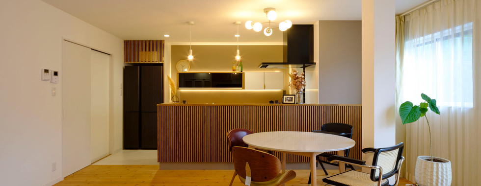 収納力抜群の造作カップボードや優しい光の間接照明など