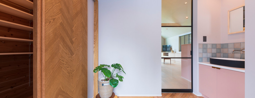 エントランス|玄関から入ってすぐの場所に手洗い場をレイアウト。ピンクなど淡いトーンでまとめてやわらかな雰囲気に