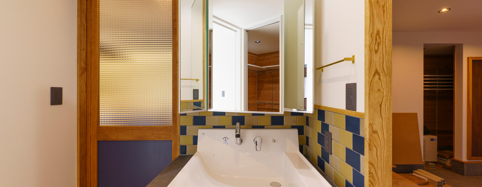パウダールーム|造作洗面化粧台。ブルー×イエローのタイルがアクセントに